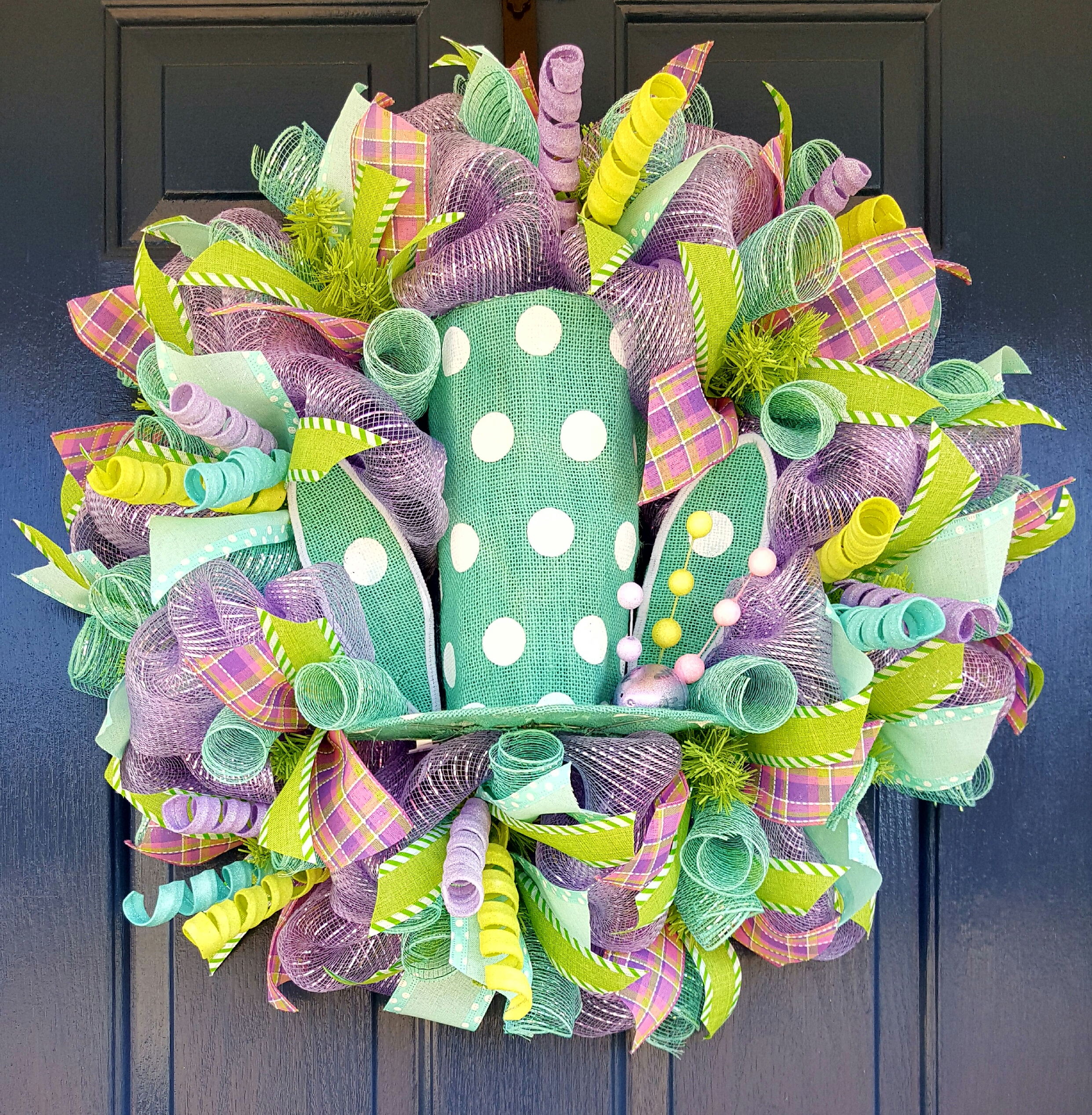 Previous Image Next Image Bunny Top Hat Top Hat Bunny Deco Mesh Wreath with ribbon and spiral trimmings $80 tax included SOLD