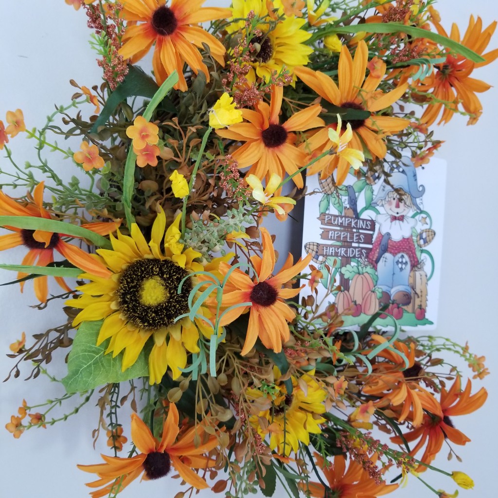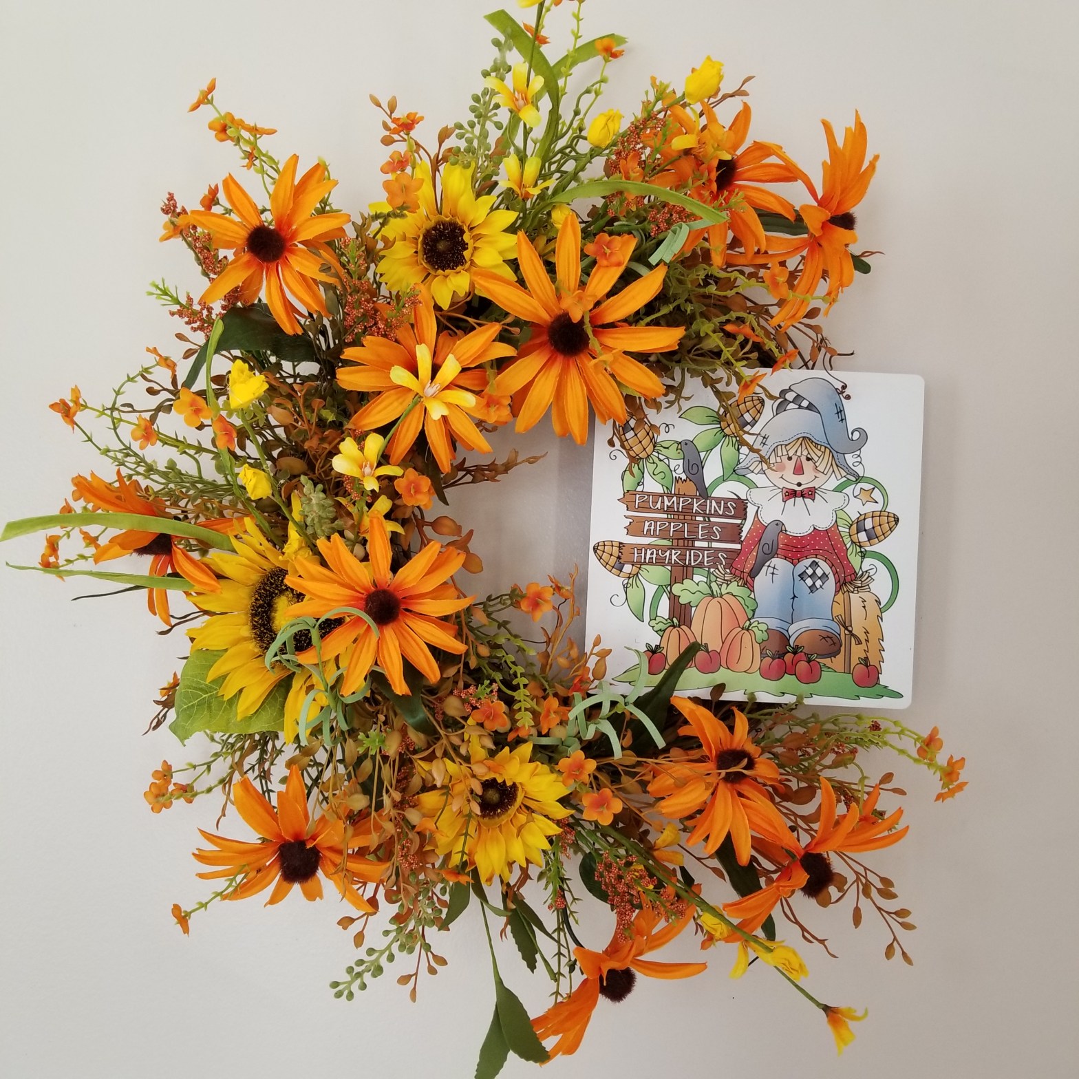 My inspiration for this wreath? Grandma’s beautiful garden of wildflowers and the scarecrow watching over her labor of love.