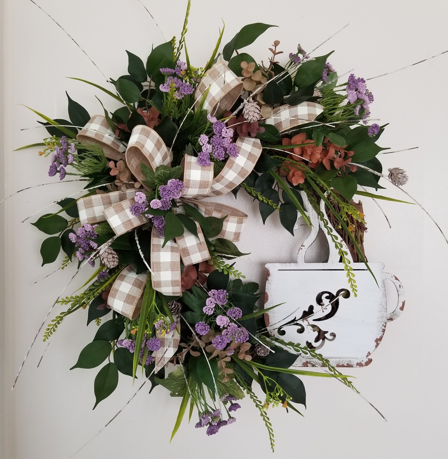 Believe it or not, this is what inspired this month’s featured wreath. It is created with the colors of warm browns, cream, variegated purple florals, birch branches and dark foliage. The focal point…a steaming cup of coffee made of metal. In my mind’s eye, it is a steaming cup of hot butter rum coffee. You will find this small pretty wreath with extra pictures to view in my Etsy shop. The link is below for your convenience.