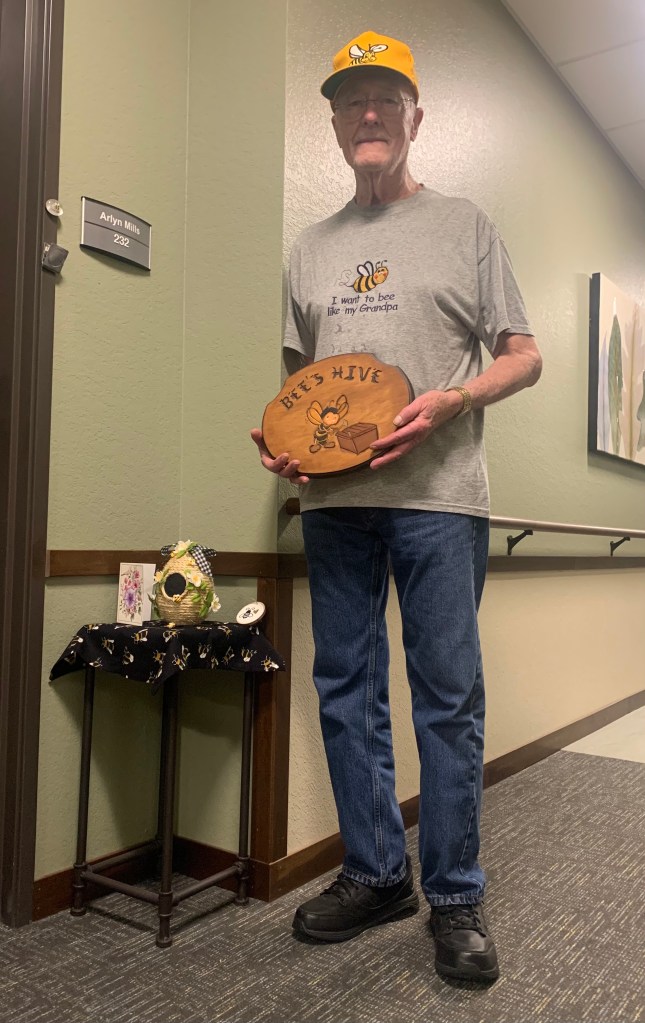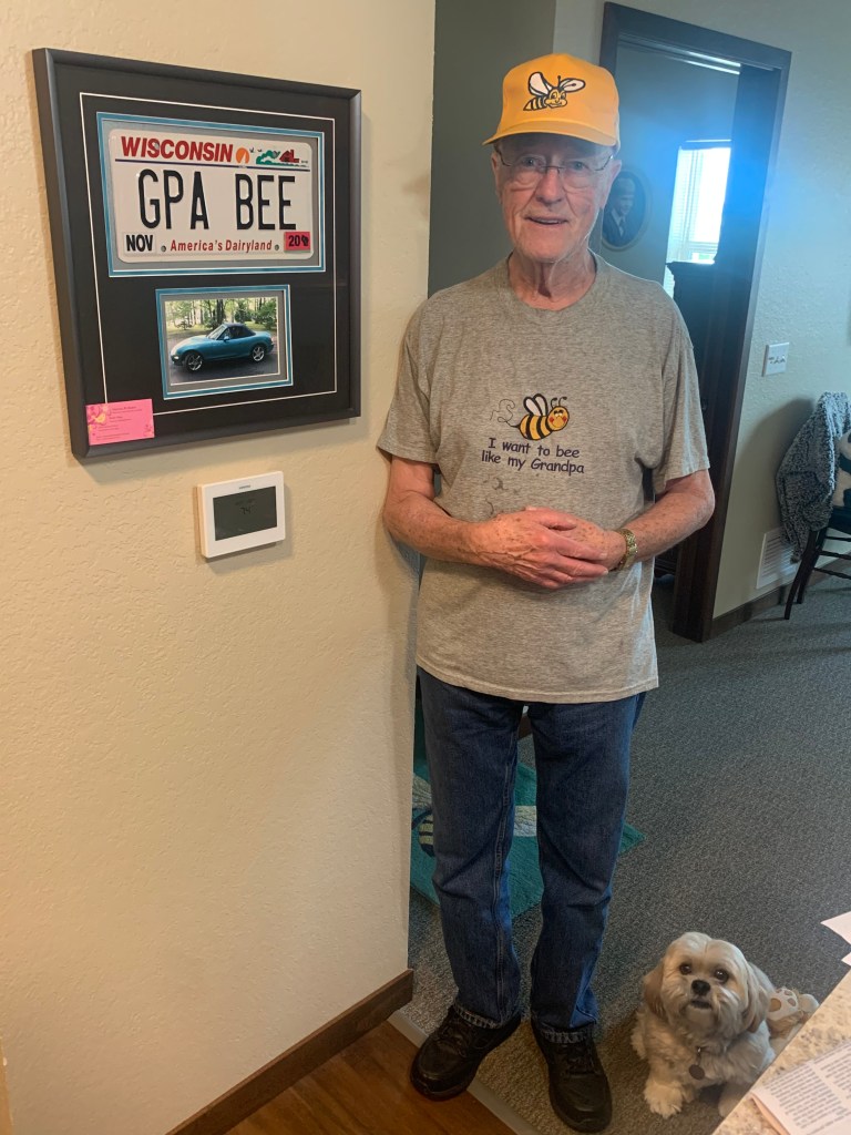 Meet Arlyn. I don’t know who his friend is sitting next to him, but are they not a cute couple? His grandson, David is pretty special too. David knows grandpa is a big “bee lover” and purchased the bee hive for him. When Arlyn received his new hive, he emailed these pictures with the subject line saying “Check out my memoraBEElia”. Don’t you love his collection? I know I do! It was a blessing to receive these pictures and yes, surprised and appreciative seeing my business card added to his memoraBEElia. Thank you!