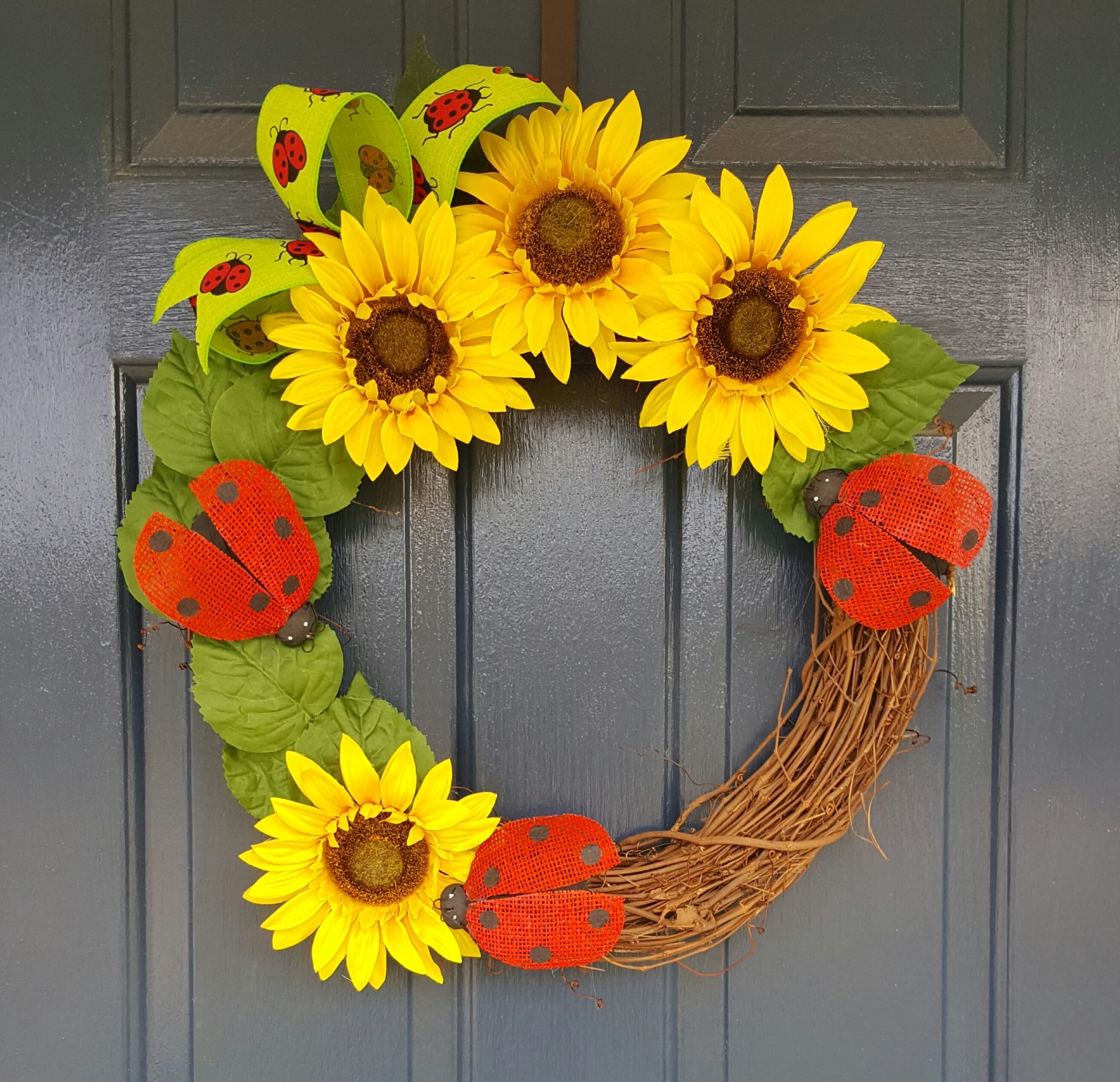 If you’re interested in making one for yourself, you’ll find a similar free pattern on Repeat Crafter’s website, http://www.repeatcrafterme.com/2015/02/crocheted-spring-wrea.html. Sarah used a 12″ Styrofoam wreath where pictured is a 16″ wreath.