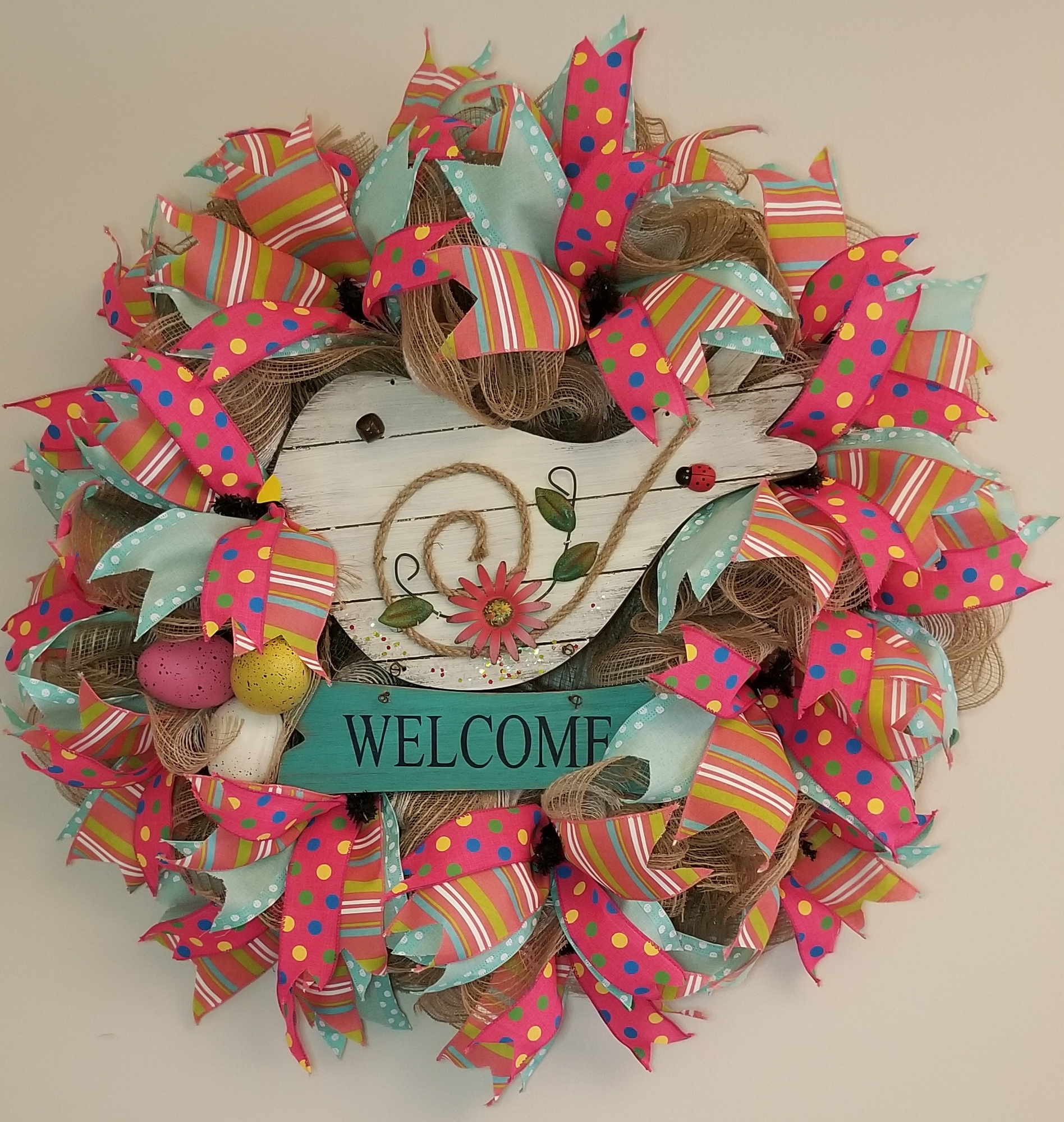 26″ burlap mesh wreath, wooden sign, wired ribbon and speckled eggs.