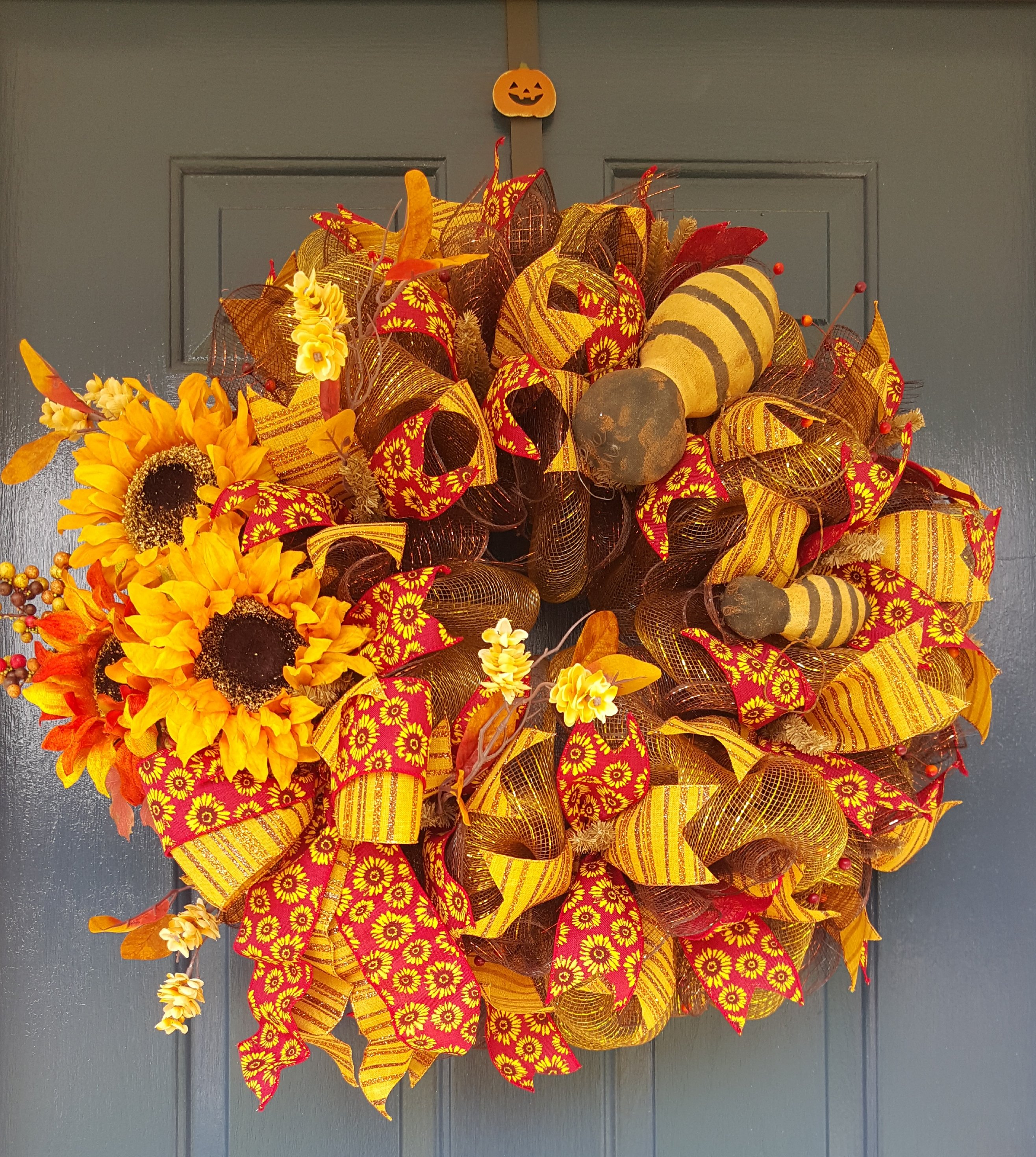 Fall Buzz 27-28″ Foil Deco Mesh wreath, rustic bumble bees, sunflowers, floral branches, red/gold berries, glitter ribbons Price: $109