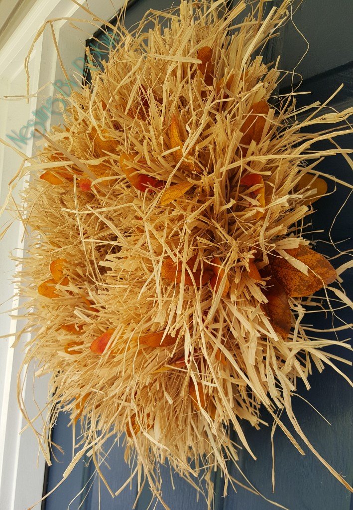 Natural Raffia Wreath 24″ wreath made with natural colored raffia. A touch of fall leaves embedded within the strands Price: $35